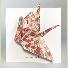 This colorful origami inspired pin features the Japanese crane, symbolizing happiness and long life. It is folded 22 times from a 4.5" square of Japanese Yuzen paper. It has a sculptural quality with a depth of 1-1.5". The paper is coated with a polycrylic medium to provide added durability and moisture resistance. Materials include paper and a brass pin backing. Size: 3"(h)x 3"(w)x1"(d)