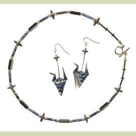 This eye-catching and lightweight origami inspired earring and necklace set is made with speciality Japanese Yuzen papers, Swarovski crystals, red Jasper gemstones, gold plated beads and stainless steel ear wires. The necklace is made with Japanese Yuzen paper beads. The paper is coated with a polycrylic medium for added durability and moisture resistance. This is a one-of-a-kind item.